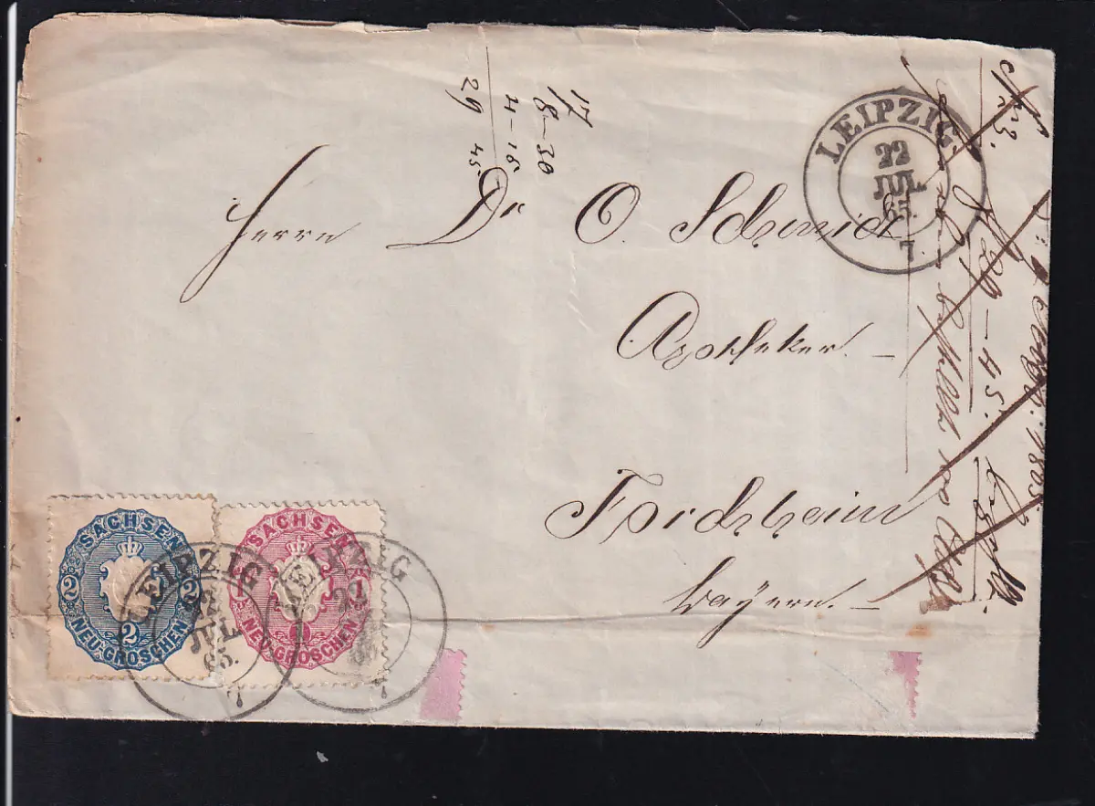 Wappen 1 Ngr. und 2 Ngr. auf Briefhülle mit K2 LEIPZIG 22 JUL 65 nach Forchheim Bayern
