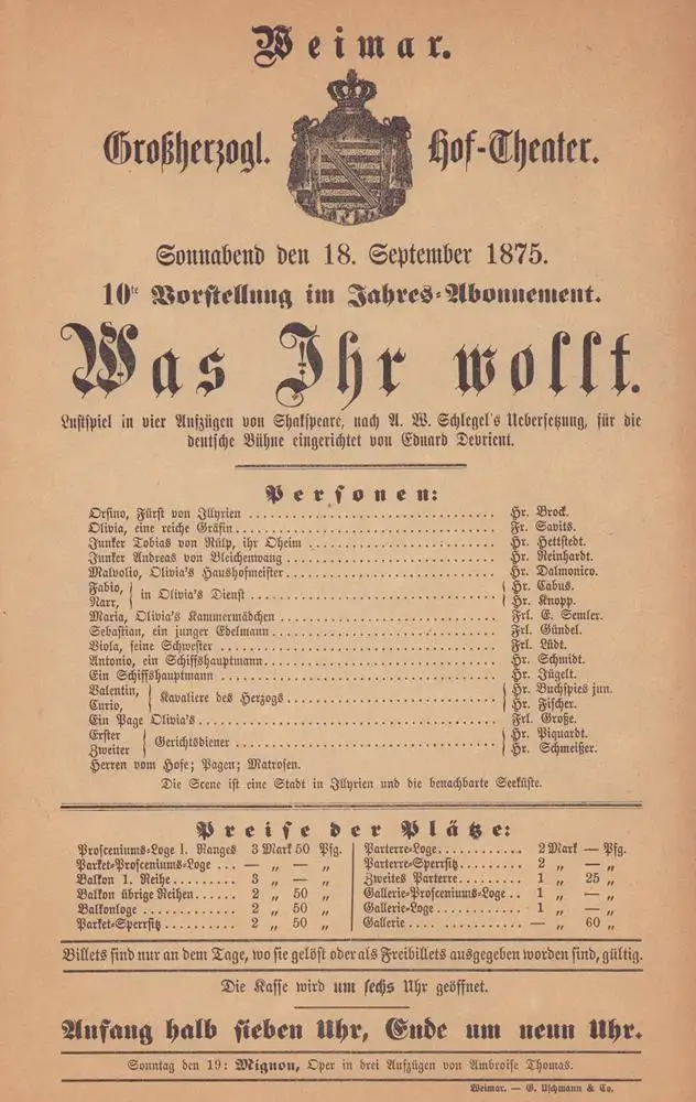 Titel: Was Ihr wollt. Lustspiel in vier Aufzügen von [William] Shakspeare [sic!], nach A(ugust) W(ilhelm) Schlegel's Uebersetzung, für die deutsche Bühne eingerichtet von Eduard Devrient. (Programmzettel). Weimar, Großherzogl. Hof-Theater. Sonnabend den 18. September 1875. 10te Vorstellung im Jahres-Abonnement