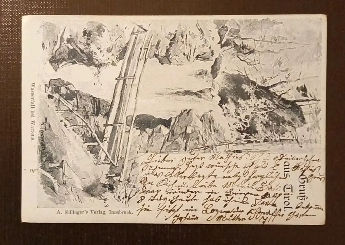 ✨ Ansichtskarte – Wasserfall bei Wattens (Tirol) – postalisch gelaufen ✨ Eine eindrucksvolle und seltene historische Ansichtskarte, die den Wasserfall bei Wattens in Tirol zeigt – ein atmosphärisches Naturmotiv, das die dramatische Schönheit der alpinen Landschaft perfekt einfängt. Ein authentisches Zeitdokument mit besonderem Sammlerwert. Die Karte zeigt eine fein ausgearbeitete, detailreiche Darstellung des Wattener Wasserfalls: kraftvoll herabstürzendes Wasser im felsigen Berggelände eindrucksvolle Szenerie aus Felsen, Wald und alpinem Relief künstlerische Lithografie bzw. Zeichnung in sepiafarbener Optik handschriftlicher Text auf der Bildseite – typisch für frühe Korrespondenz Ein ausdrucksstarkes Naturmotiv, das heute nur noch selten vollständig erhalten zu finden ist. Die Rückseite weist alle Merkmale echter Zeitgeschichte auf: Poststempel klar lesbar alte Briefmarke (teils fehlend, aber erkennbar) schwungvolle Handschrift aus der Zeit Ein wertvolles Stück österreichischer Post- und Heimatgeschichte. Guter, sammelwürdiger Zustand mit den üblichen Alters- und Gebrauchsspuren historischer, gelaufener Karten. Sorgfältig verpackt, damit diese seltene Tiroler Bade- und Wasserfallkarte sicher bei Ihnen eintrifft.