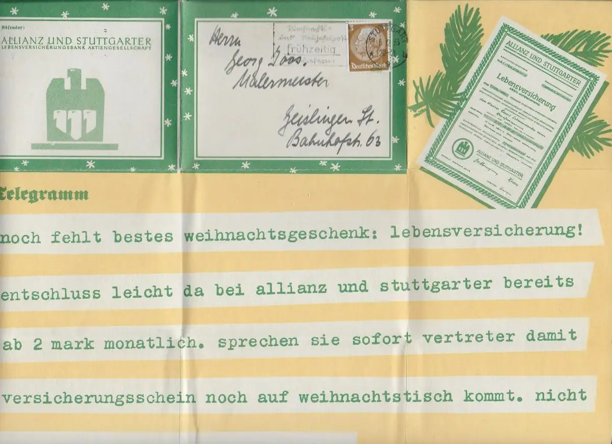 Weihnachtspost Stuttgart 1933, Rückseitig Werbung Allianz, Faltbrief