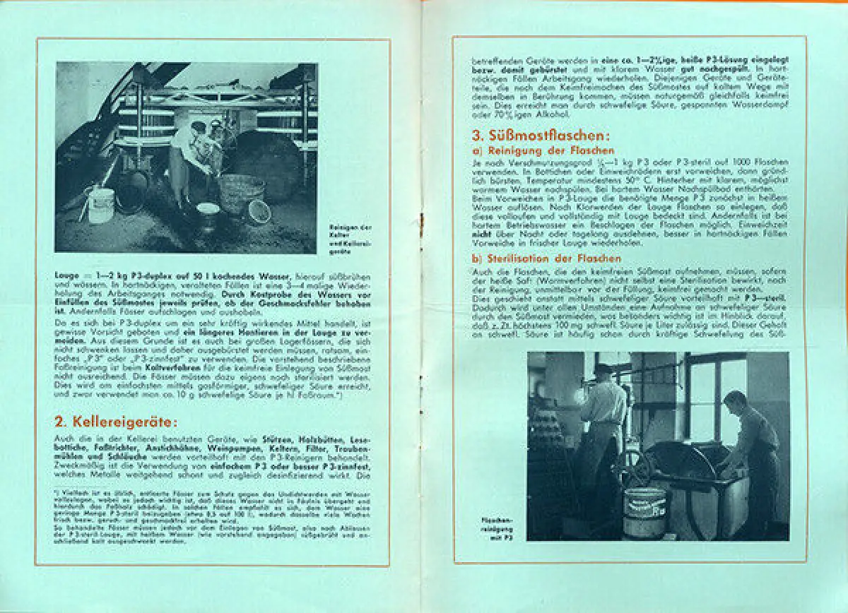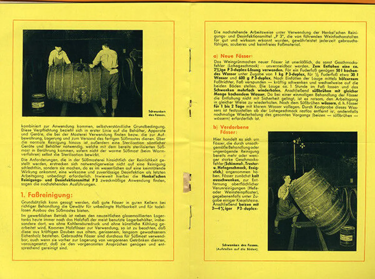DÜSSELDORF HENCKEL AG WERBUNG REKLAME UND WIRTSCHAFTSGESCHICHTE Weine und Süssmoste haltbarer und lagerfähiger durch Henckels Reinigungs und Desinfektionsmittel Werbeprospekt mit Anschreiben um 1947 mit GESAMT 8 Seiten fotografischen und druckgrafischen Abbildungen die Süssmostherstellung Erzeugung gesunder und haltbarer Nahrungsmittel die Reinigung von Fässern mittels Henckel Präperaten Reinigung von Kellereigeräten Reinigung und Sterilasation von Mostflachen Leichte Alterspuren Format 21cm x 15cm.Die ausgewählten Bild Beispiele haben eine unterschiedliche Auflösung was die Wiedergabe durch den Scan beeinträchtigen kann. Mobiltaugliche Galerien bei TRIXUM.DE Bücher Papier und Dokumente deutscher Zeitgeschichte 1800-1960 Ankauf und Verkauf Besuchen Sie unser Ladengeschäft in Darmstadt Antiquariat Stefan Jähnig Reiseführer Orts und Landeskunde Landkarten Regionalgeschichte Wirtschaft Industrie und Technik Landwirtschaft und Gartenbau Geschichte Historika Kolonien und Seefahrt Weltkrieg und Militaria Presse Zeitungen und Zeitschriften Buchkunst Exlibri Literatur und Kunstgeschichte Mode Design Werbeschriften Kataloge und Prospekte Firmenrechnung Dokumente Urkunden Oblaten Glanzbilder Reklamemarken und Vignetten Postkarten Ansichtskarten historische Photographie Sammelbilder moderne Literatur und Gegenwart Romane Erzählungen Publizistik deutsche und internationale Autoren VERSANDKOSTEN Die Versandkosten richten sich nach den aktuellen Tarifen der Deutschen Post AG. Für ihre Anfragen und Wünsche habe ich ein offenes Ohr! Weitere Angebote finden Sie in meinem Ebay Shop Nachlass-Bearbeitung Ankauf von Büchern und Sammlungen