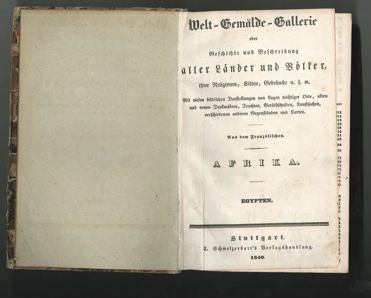 Bemerkungen: Ägypten-Band aus der Reihe "Welt-Gemälde-Gallerie oder Geschichte und Beschreibung aller Länder und Völker" auf Basis von Jacques-Joseph Champollion-Figeacs (1778-1867) Werk "LÉgypte ancienne", in der Übersetzung von Carl A. Mebold. Es fehlen die Tafeln 13, 82, 83, 89 und 92. Beigebunden sind 56 Seiten "Abyssinien von Noel Desvergers" mit 12 Tafeln und 36 Seiten " Algier von P. Rozet" mit 8 Tafeln.