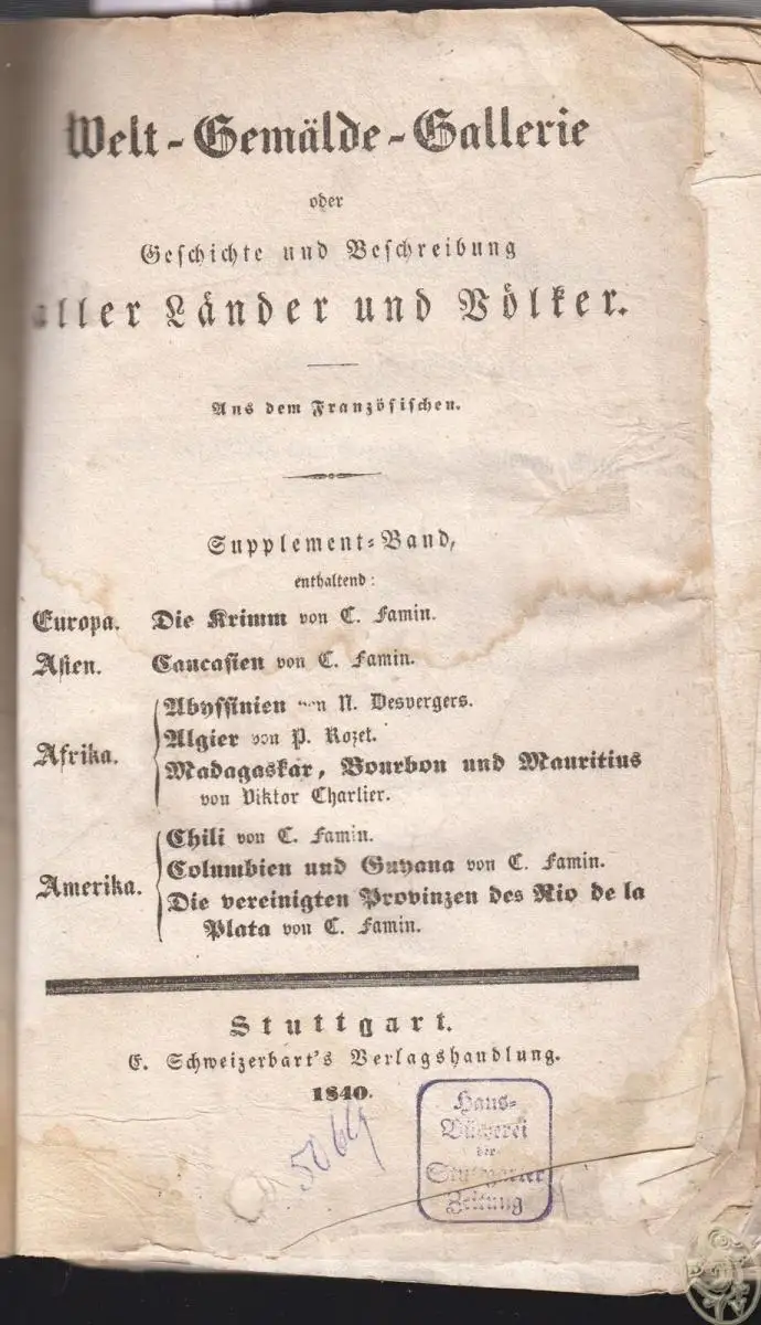 Bemerkungen: Engelmann 58f.; Fromm III, 8793f. - Sammelband enthält: FAMIN, C. Die Krim. Caucasien. DESVERGERS, N. Abyssinien. ROZET, P. Algier. CHARLIER, Victor. Madagaskar, Bourbon und Mauritius. FAMIN, C. Chili. Columbien und Guyana. Die vereinigten Provinzen des Rio de la Plata. Mit Ansichten von Sebastopol, der Krim, Tiflis, Algier, Oran, Altertümern, Trachten etc.