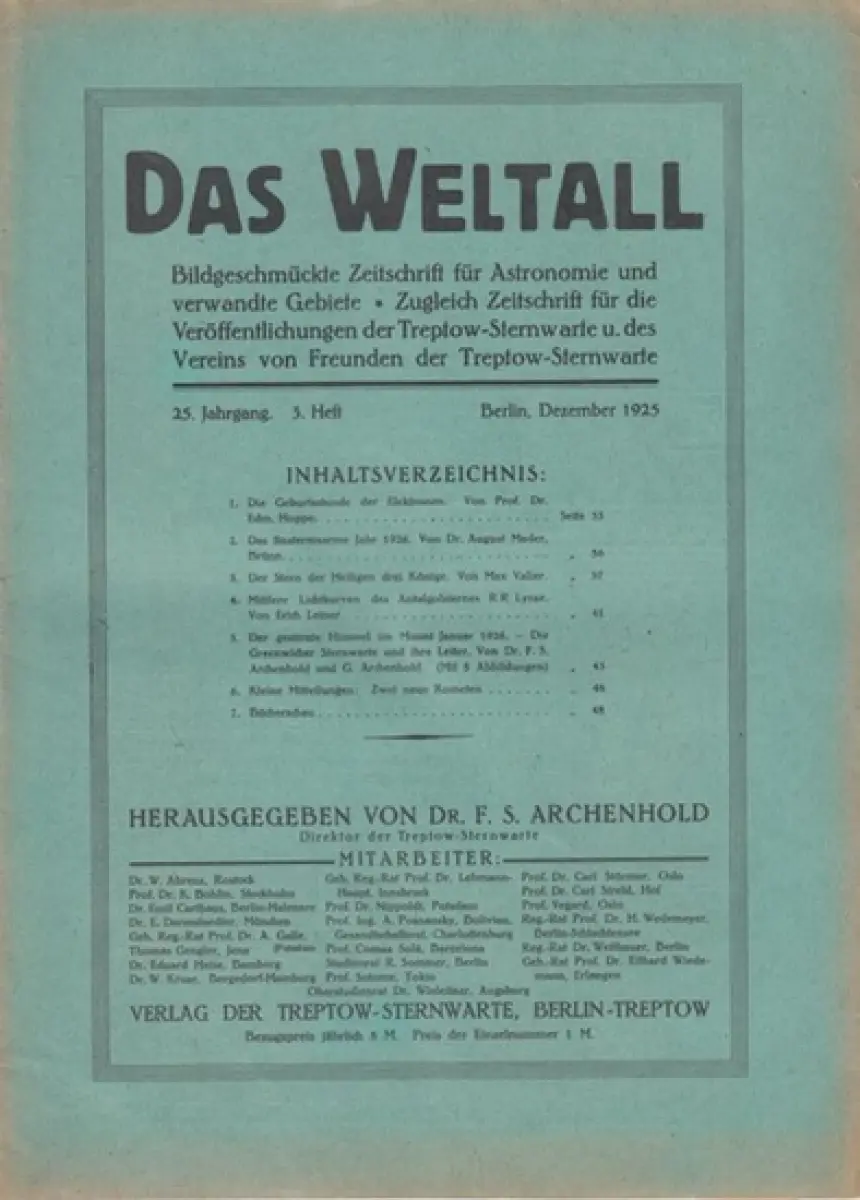 Weltall, Das. - Archenhold, Friedrich Simon (Hrsg.): Das Weltall. 25. Jahrgang, 3. Heft. Dezember 1925. Bildgeschmückte Zeitschrift für Astronomie und verwandte Gebiete. Zugleich Zeitschrift für die Veröffentlichungen der Treptow-Sternwarte und des Verein