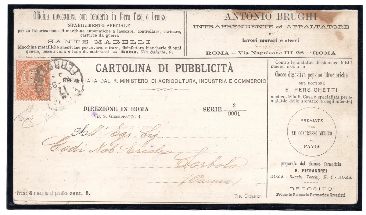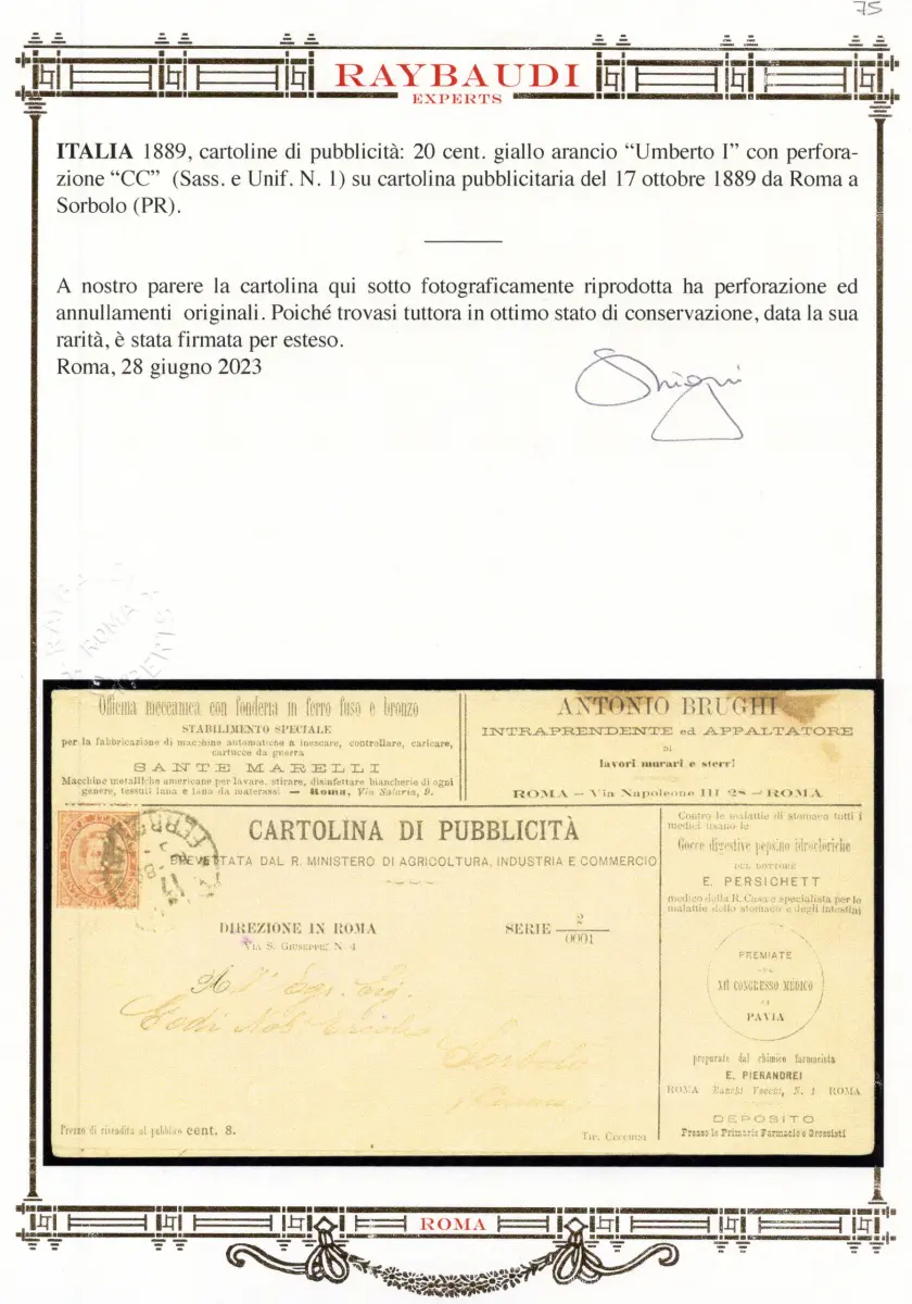 BUSTA - Werbekarte Nr. 1 - Umberto I. Cent. 20 perforierte DC auf Postkarte mit Werbeanzeigen verschiedener Firmen u.a. Sante Marelli und Antonio Brughi - zwei Vergilbungsflecken oben rechts - Sehr selten - AD, Cert. Fiecchi e Cert. Ray. gold - Kat. euro 11.000 Cod.73/182