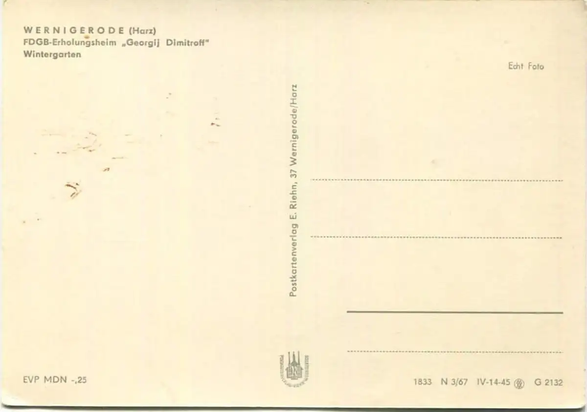 Wernigerode - FDGB-Erholungsheim Georgij Dimitroff - Wintergarten - Foto-AK Grossformat - Verlag E. Riehn Wernigerode - Gebrauchsspuren (E24733)