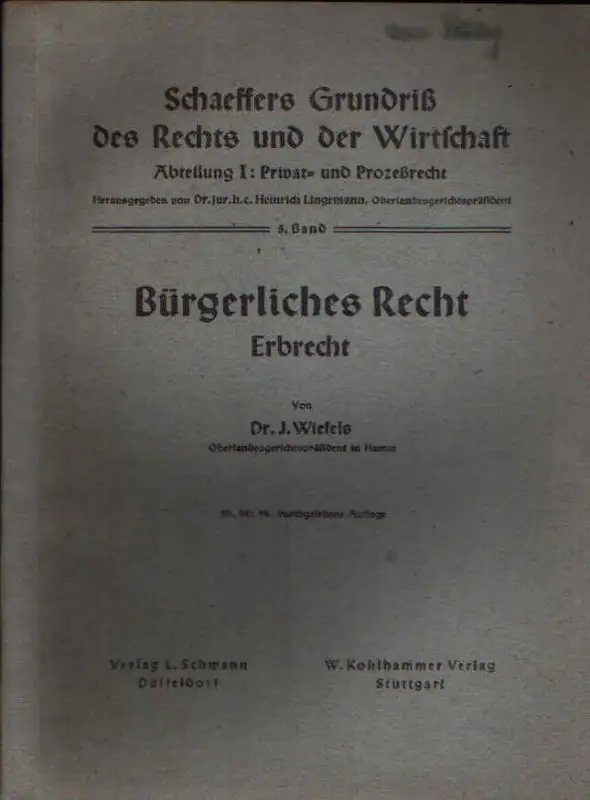 Bürgerliches Recht; Erbrecht; J. Wiefels; Gesetzliche Erbfolge; Gewillkürte Erbfolge; Rechtliche Stellung des Erben; Pflichtteil und Vermächtnis; Wirtschaft; Privatrecht; Prozessrecht; Recht; Jura; Gesetze; Gesetzestexte; Justiz