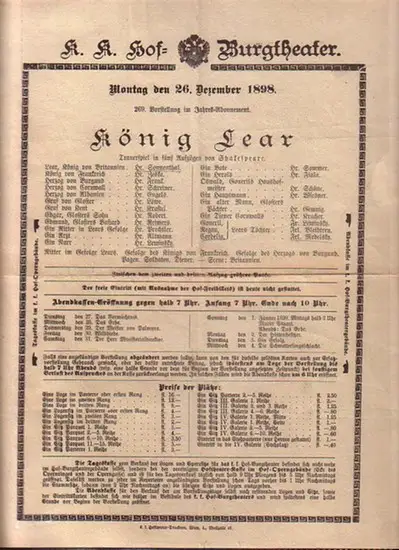 Titel: Programm-Zettel zu ' König Lear '. Trauerspiel in 5 Aufzügen. Mitwirkende: Sonnenthal, Zeska, Frank, Schreiner, Engels, Löwe, Krastel, Bleibtreu, Lewinsky u.a. Aufführung : 'K. K. Hof-Burgtheater', Wien am 26. Dezember 1898