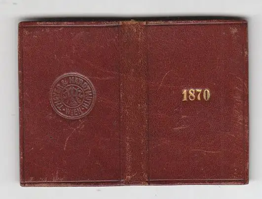 Bemerkungen: Miniaturkalender mit goldgeprägt. Jahreszahl am Vorderdeckel, blindgeprägt. Medaillon (Theyer & Hardtmuth, Wien) am Hinterdeckel, Streicheisen auf beiden Deckeln, Vollgoldschn, Seidenvorsatz.