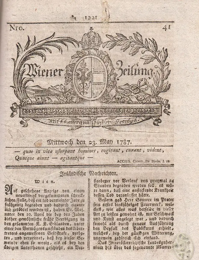 Bemerkungen: Enthält u. a. Nachrichten aus dem Inland und aus allen Staaten Europas, Zum Beispiel eine Reise des Kaisers duch Mähren und die polnischen und galizischen Regionen der habsburgischen Herrschaft, sowie Bericht über Reformgesetze Kaiser Joseph II., Listen der Verstorbenen zu Wien, Hausverkäufe in Wien und seiner nächsten Umgebung, Buchversteigerung aus Konkursmasse unter den Tuchlauben. Am Mittwoch den 24. May 1787 wird auf der ersten Seite berichtet: `Gestern gab Herr Stuwer im Prater sein erstes diesjähriges Feuerwerk, welches, wie alles was derselbe in dieser Art zu leisten gewohnt ist, mit Geschmack und Kunst angelegt war ...` Die Wiener Zeitung wurde 1703 als Wiennerisches Diarium gegründet. Die erste Ausgabe erschien am 8. August 1703. Damit handelt es sich um die älteste noch erscheinende Tageszeitung der Welt.