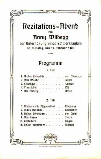 Wildegg, Anny: Programm-Zettel zu: Rezitations-Abend von Anny Wildegg zur Unterstützung eines Schwerkranken am Dienstag, den 18. Februar 1908.
