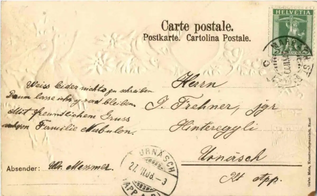 Danke. Alles Bestens. Können Sie mir allenfalls mitteilen, aus welchem Jahr die Postkarte stammt? Besten Dank.