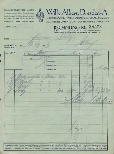 1 Seite DinA4 Grosshandel Sprechappaate, Schallplatten u.a. Dresden A1, Pfarrgasse 8 Leichte Gebrauchsspuren, gelocht