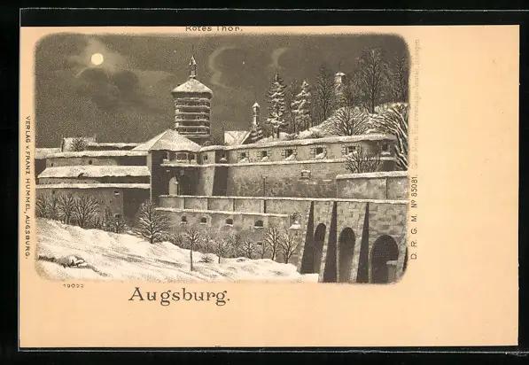 Winter-Lithographie Augsburg, Rotes Tor bei Vollmond