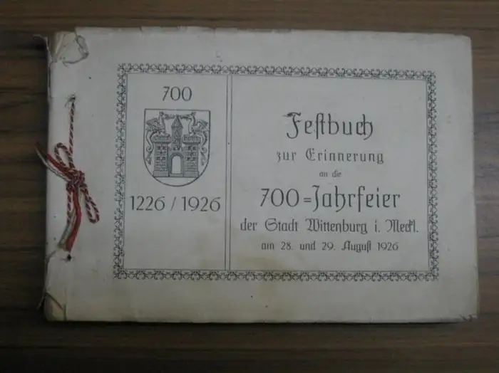 Titel: Festbuch zur Erinnerung an die 700-Jahrfeier der Stadt Wittenburg i. Meckl. am 28. und 29. August 1926 (1226-1926). Der historische Festzug anschließend der Festzug für Handel, Gewerbe, Landwirtschaft, Gemeinnützige Unternehmen und Sport, voraufgehend Geleitwort, Chronik der Stadt W. und Festpredigt zur 700-Jahrfeier der Stadt Wittenburg