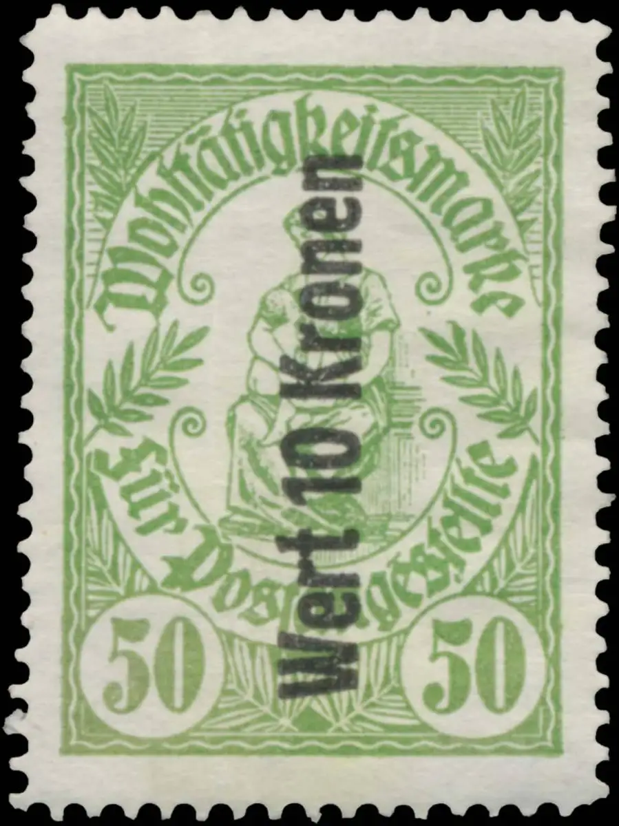 50, grün, Wert 10 Kronen, Post, Österreich, Spendenmarke, Größe/Zustand: 4x3 , guter Zustand, Original alte Reklamemarke die seinerzeit für die Werbung benutzt wurde