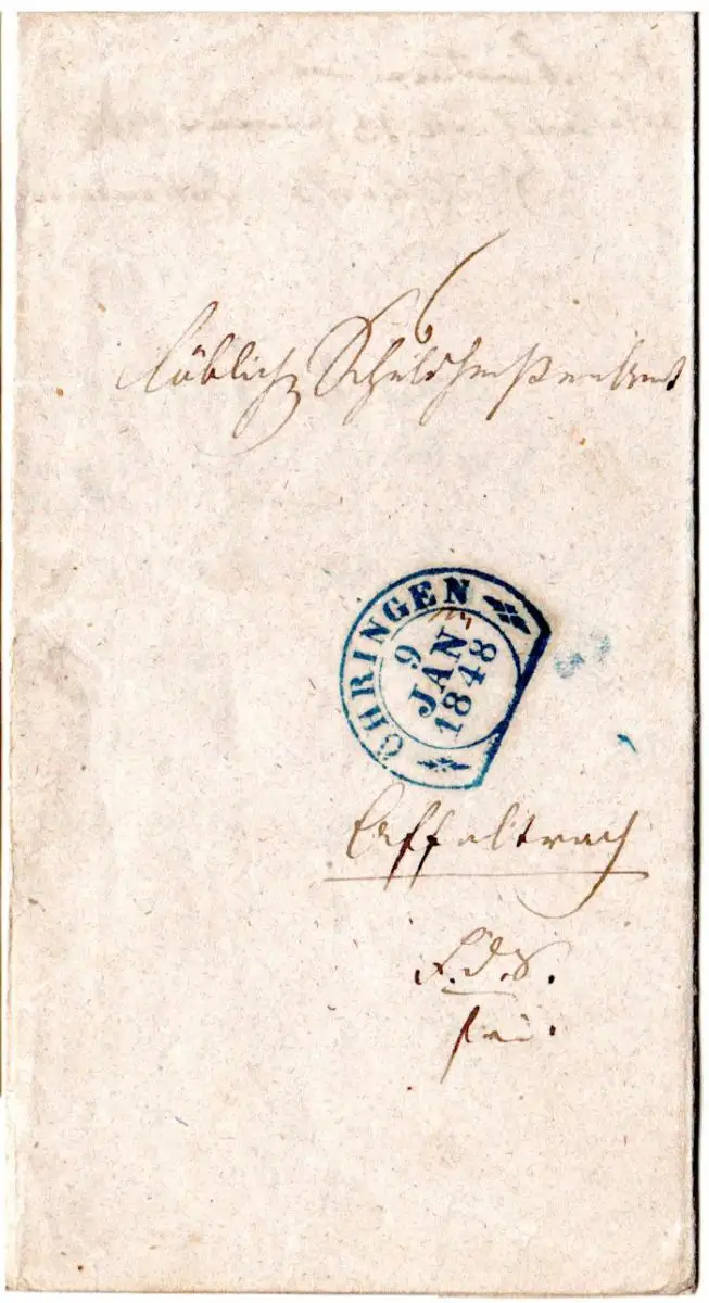 Württemberg 1848, blauer Steigbügelstpl. ÖHRINGEN auf Frankobrief n. Affaltrach