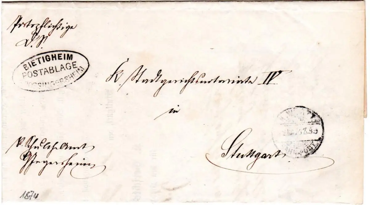 Württemberg 1874, Postablage GROSSINGERSHEIM (Bietigheim) auf Brief n. Stuttgart