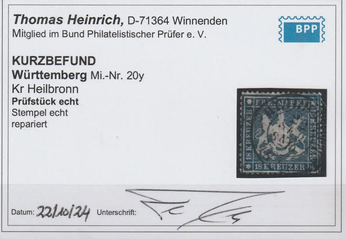 Württemberg: Nr. 20y, gestempelt, Befund Heinrich BPP