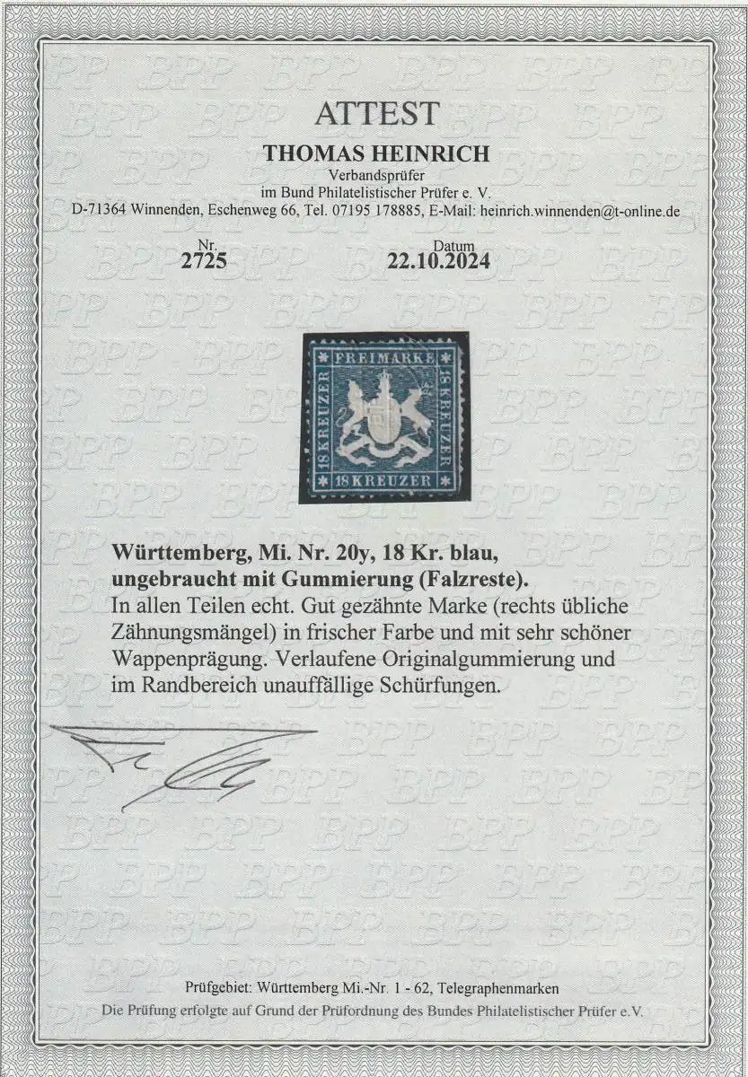 Württemberg: Nr. 20y, ungebraucht, Attest Heinrich BPP