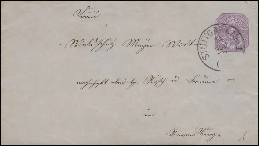 Württemberg Umschlag 5 Pf. STUTTGART 14.11.(78?) nach RAVENSBURG 14.11.