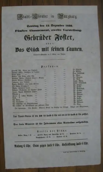 Würzburg, Stadttheater. - Direktion: Karl Friedrich Grabowsky. - Karl Töpfer: Besetzungszettel zu: Gebrüder Foster, oder: Das Glück mit seinen Launen. - Sonntag, den 12. Dezember 1858, fünftes Abonnement, zweite Vorstellung, im Stadt-Theater in Würzburg.