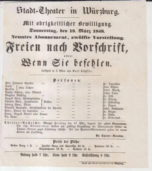 Titel: Besetzungszettel zu: Freien nach Vorschrift, oder: Wenn Sie befehlen. - Donnerstag, den 18. März 1858, neuntes Abonnement, zwölfte Vorstellung im Stadt-Theater in Würzburg. - Lustspiel in 4 Akten von Karl Töpffer. - Mitwirkende: die Herren Danielson, Lippert, Fellenberg, Strentz, Wiederhold, Bosin, Berger und Dill / Fräulein Oeser, Bachmann, Moritz / Frau Kißner.