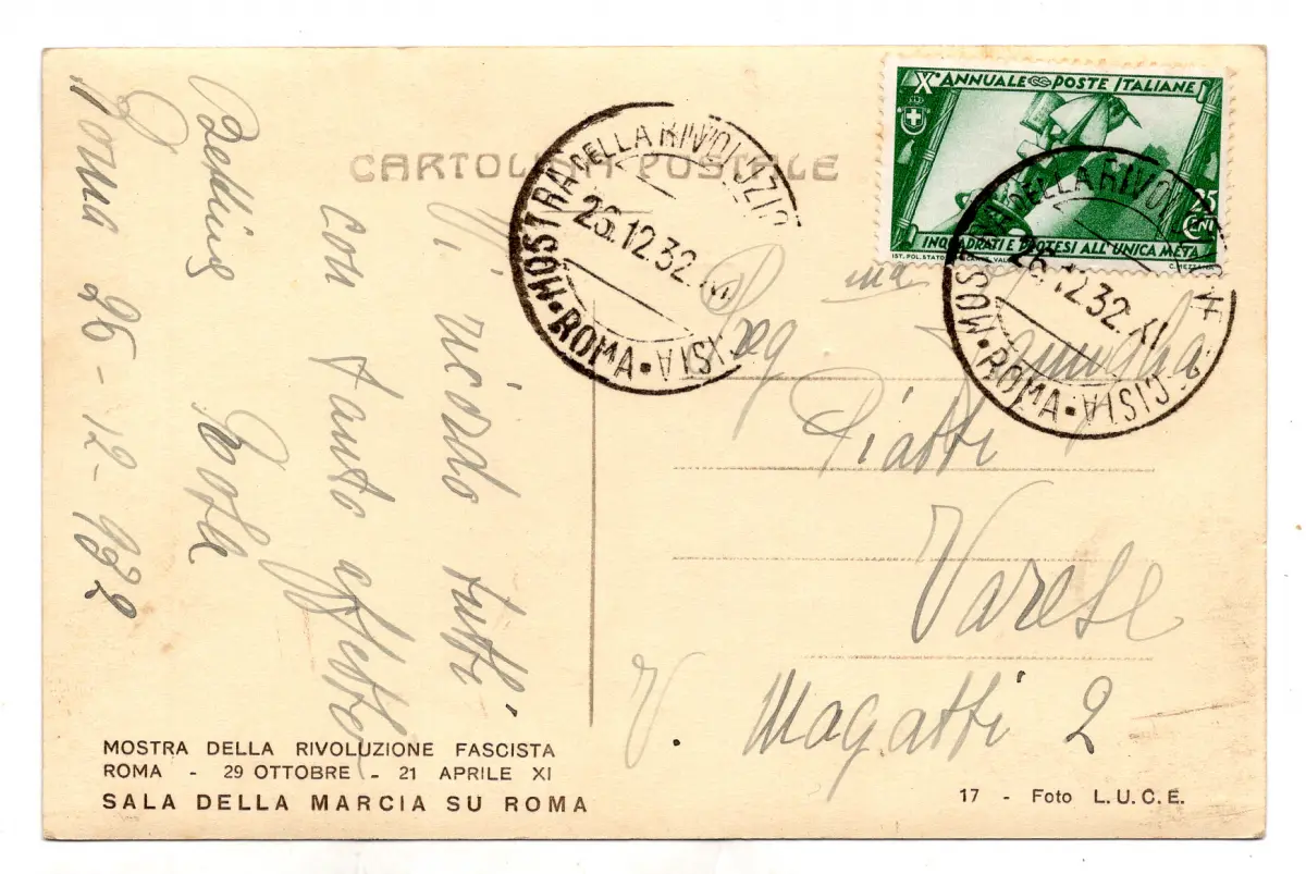 X. Marsch auf Rom Cent. 25 Blocks auf Postkarte - X. Marsch auf Rom Cent. 25 Nr. 329 isoliert auf Postkarte Ausstellung der Faschistischen Revolution gereist von Rom nach Varese am 26.12.32 - ab Jahrgang Jahrgang Sonderausstellungsmerkmal - Ungewöhnliche Nr. 111/20