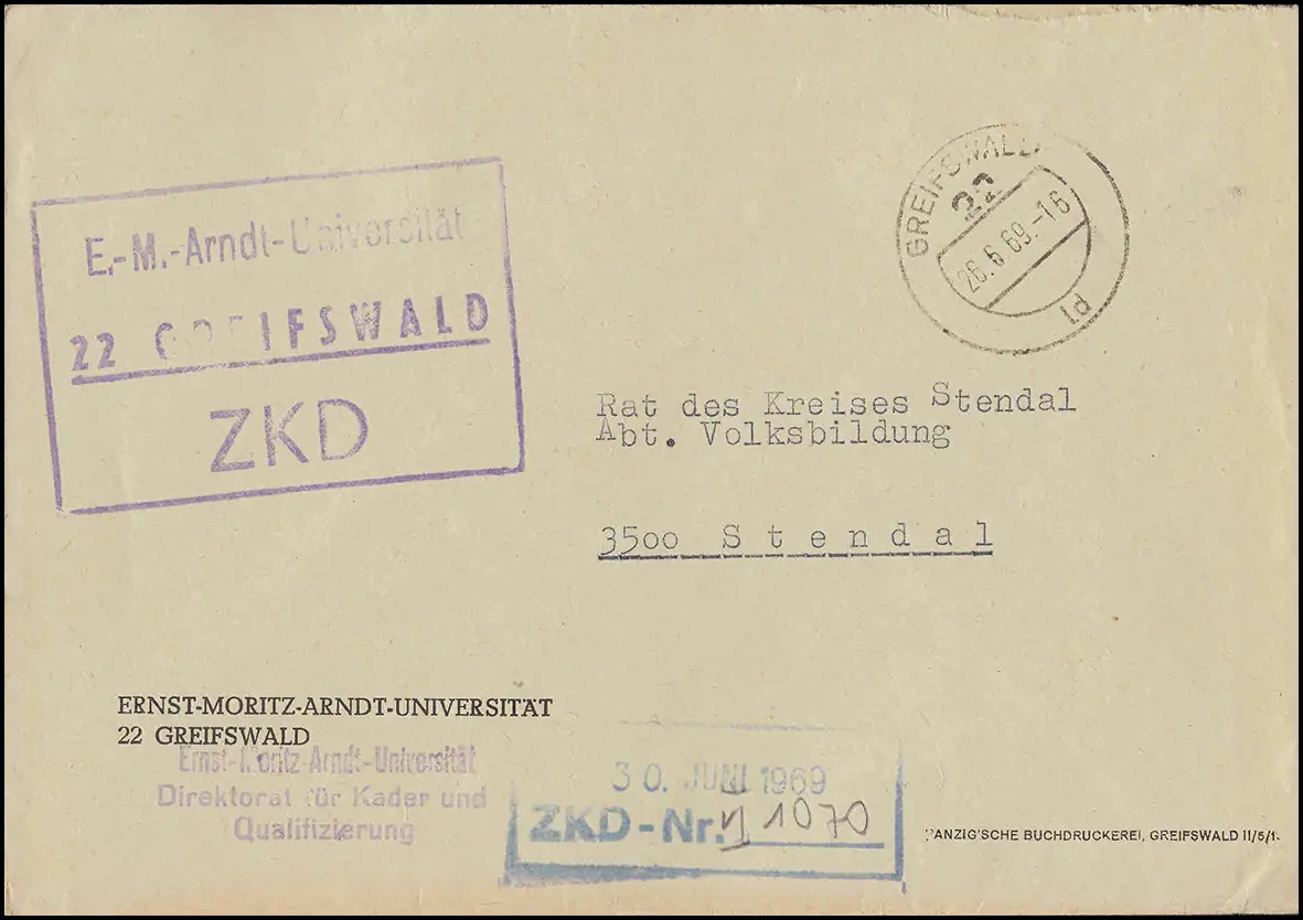 ZKD-Brief Ernst-Moritz-Arndt-Universität GREIFSWALD 26.6.69 nach STENDAL 30.6.69