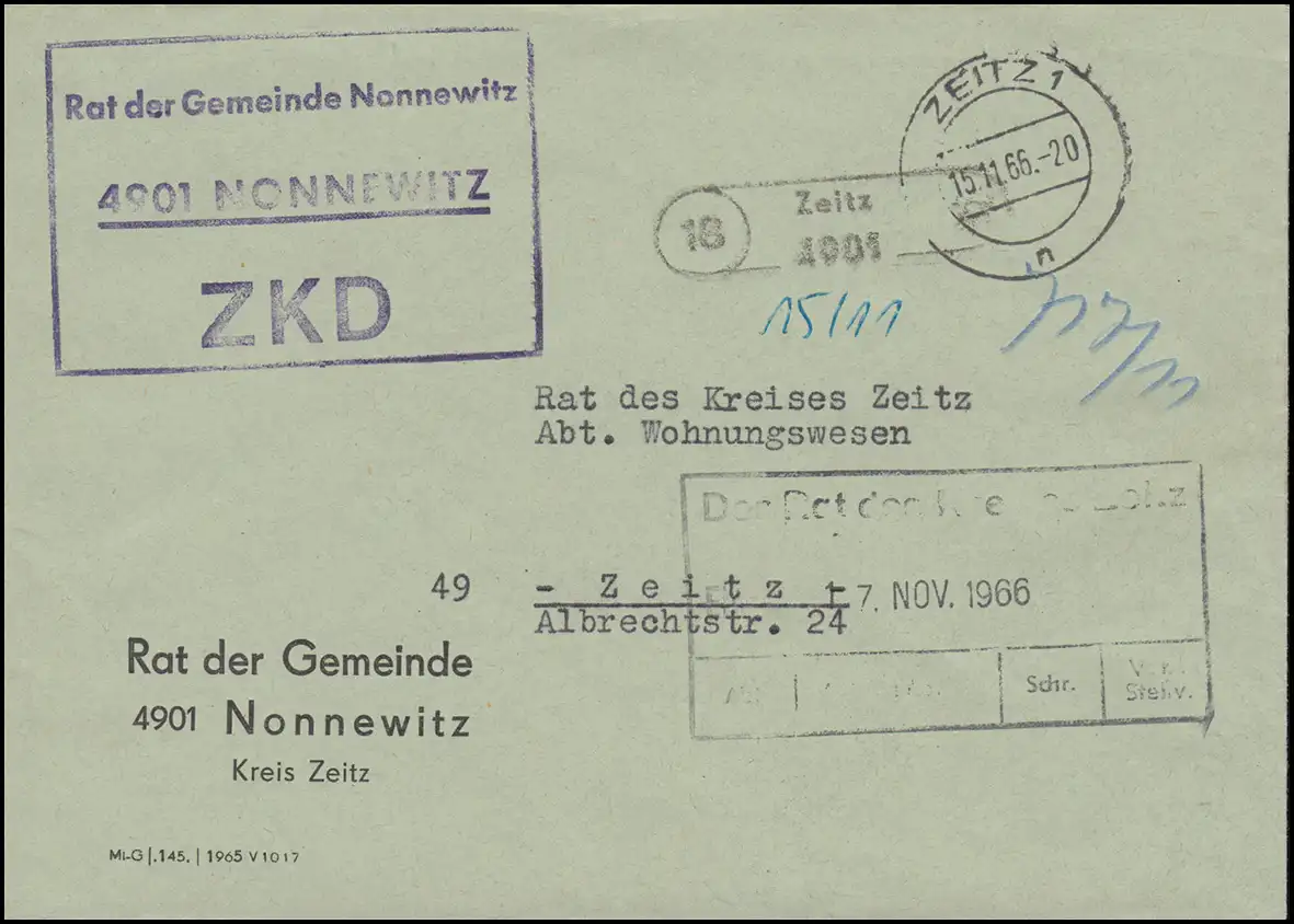 ZKD-Brief vom Rat der Gemeinde Nonnewitz Orts-Brief ZEITZ 15.11.66 an den Rat