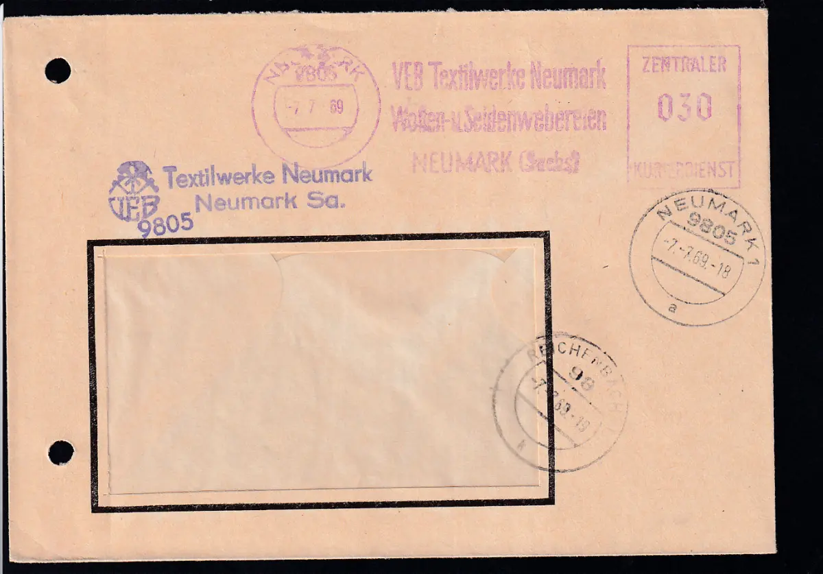 ZKD-Freistempel des VEB Textilwerke Neumark auf Fensterbrief, Brief Aktenlochung