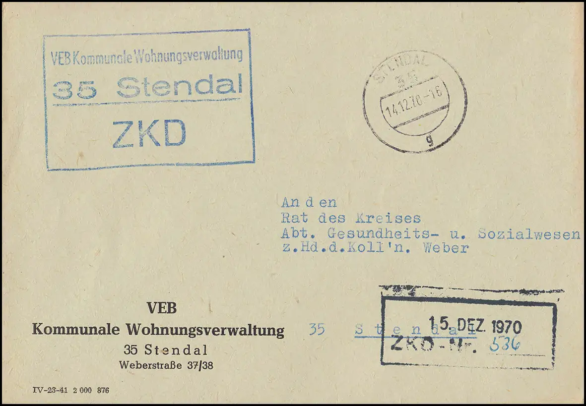 ZKD-Ortsbrief VEB Kommunale Wohnungsverwaltung STENDAL 14.12.70 an Kreisrat