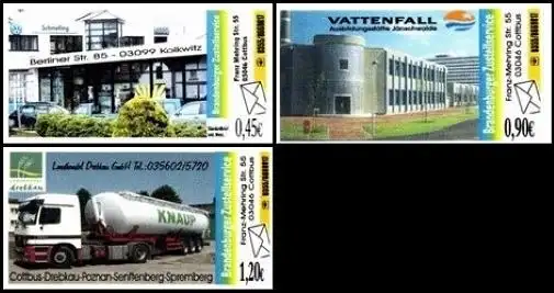 • MichSeite ZSBB: Nr. 1 - 3, 00.00.2004, "ZSBB Cottbus", Satz, postfrisch Beschreibung \nAusgabeland: Bundesrepublik Deutschland \nPostdienstleister: Brandenburger Zustellservice, Cottbus \nAusgabeanlass: Briefmarkenausgabe "ZSBB Cottbus: Autohaus VW Schmolling, VATTENFALL, Landhandel Drebkau" Katalognummer: Nr. 1 - 3 Ausgabedatum: 00.00.2004 Nominale: Satz (3 Werte) zu 0,45 EUR, 0,90 EUR, 1,20 EUR \nTyp: - \nErhaltung: postfrisch \nHinweis: - Thema: Lausitz, Autohaus, Agrar, Fahrzeuge, KNAUP