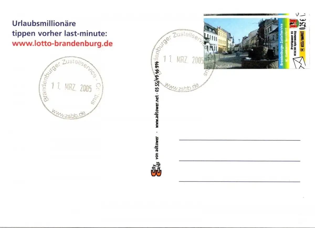 • MichSeite ZSBB: Nr. 1, 00.00.2004, "ZSBB Spremberg", Ganzstück (Postkarte), Tagesstempel ZSBB Beschreibung \nAusgabeland: Bundesrepublik Deutschland \nPostdienstleister: Brandenburger Zustellservice, Spremberg \nAusgabeanlass: Briefmarkenausgabe "ZSBB Spremberg: Bullwinkelbrunnen" Katalognummer: Nr. 1 Ausgabedatum: 00.00.2004 Nominale: Wert zu 0,25 EUR \nTyp: - \nErhaltung: Ganzstück (Postkarte), Tagesstempel ZSBB \nHinweis: - Thema: Lausitz