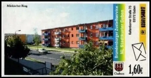• MichSeite ZSBB: Nr. 7, 00.00.2004, "ZSBB Guben, 2. Ausgabe", postfrisch Beschreibung \nAusgabeland: Bundesrepublik Deutschland \nPostdienstleister: Brandenburger Zustellservice, Guben \nAusgabeanlass: Briefmarkenausgabe "ZSBB Guben 2. Ausgabe: Märkischer Riung" Katalognummer: Nr. 7 Ausgabedatum: 00.00.2004 Nominale: Wert zu 1,60 EUR \nTyp: - \nErhaltung: postfrisch \nHinweis: - Thema: Lausitz