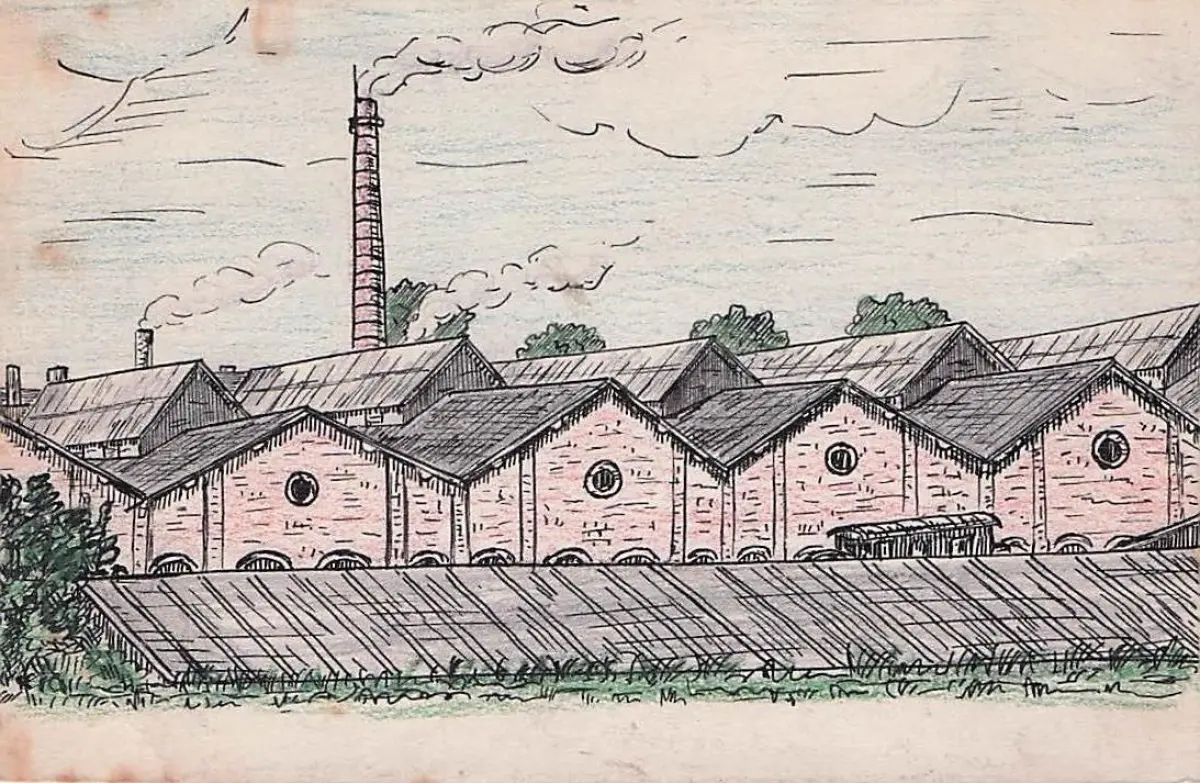 Zeichnung einer Fabrik oder Industrieanlage mit mehreren Gebäuden und einem hohen Schornstein, aus dem Rauch aufsteigt. -793464
