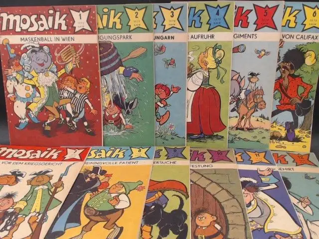 Titel: Mosaik-Bilderzeitschrift: Kompletter Jahrgang 1979 mit 12 Heften: Mosaik 1/1979: Maskenball in Wien; Mosaik 2/1979: Im Vergnügungspark; Mosaik 3/1979: Nachrichten aus Ungarn; Mosaik 4/1979: Offener Aufruhr; Mosaik 5/1979: Das Ende des Regiments; Mosaik 6/1979: Auf der Spur von Califax; Mosaik 7/1979: Vor dem Kriegsgericht; Mosaik 8/1979: Der geheimnisvolle Patient; Mosaik 9/1979: Befreiungsversuche; Mosaik 10/1979: In der Festung; Mosaik 11/1979: Der Sieg: Mosaik 12/1979: Matyi der Gänsehirt