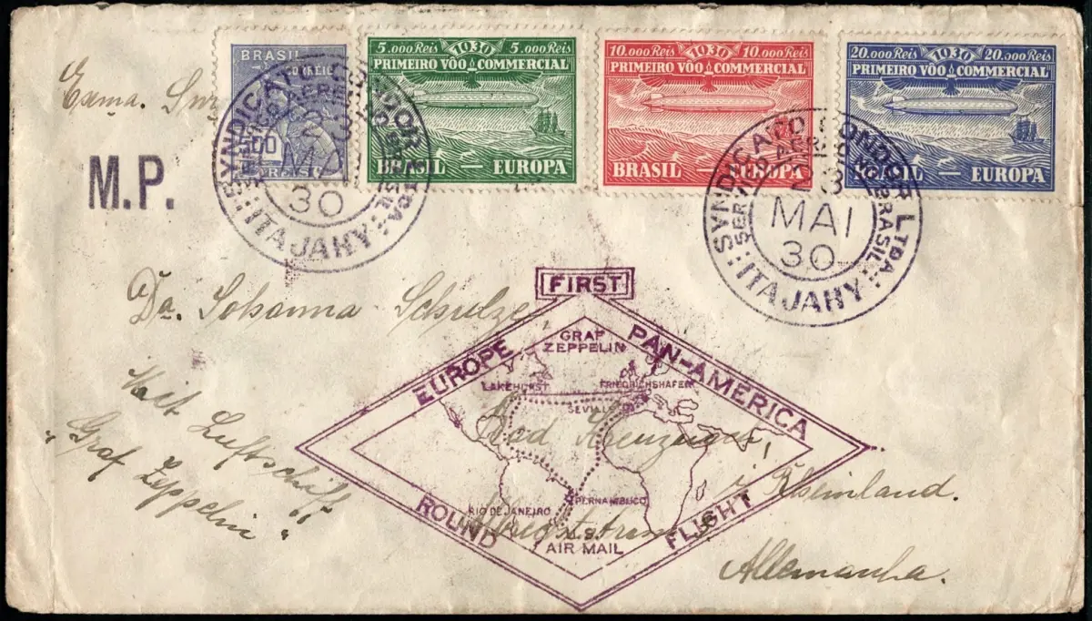 Mischfrankatur Brasilien und Privatmarken der Luftschiffbau Zeppelin (ZP 1-3).