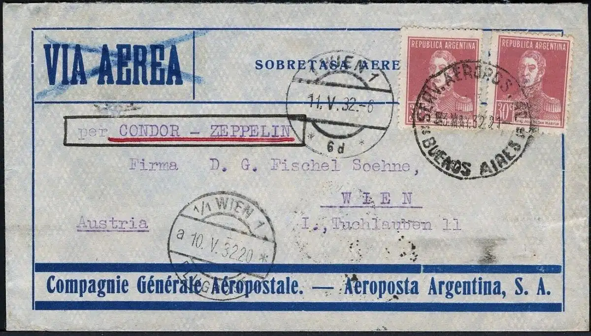 Brief via 4. Südamerikafahrt 1932 aus Buenos Aires über Friedrichshafen nach Österreich gelaufen. Beide Ankunftsstempel Wien vorderseitig abgeschlagen.