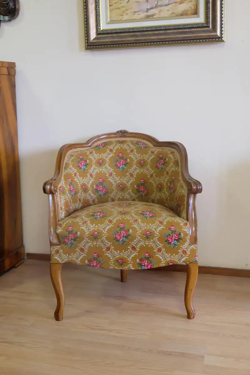 Ein restaurierter, zierlicher Fauteuil, neu tapeziert sehr schöner Zustand, mit drei Beinen.