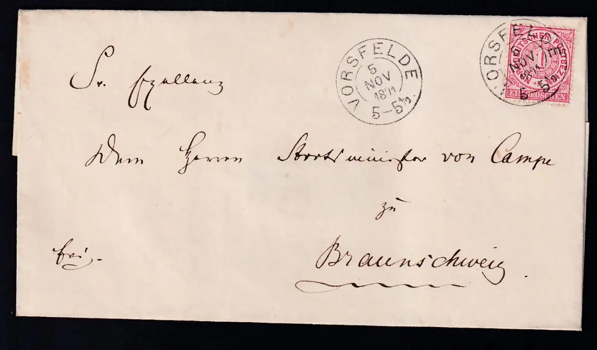 Ziffer 1 Gr. auf Briefhülle mit K2 VORSFELDE 5 NOV 1871 nach Braunschweig