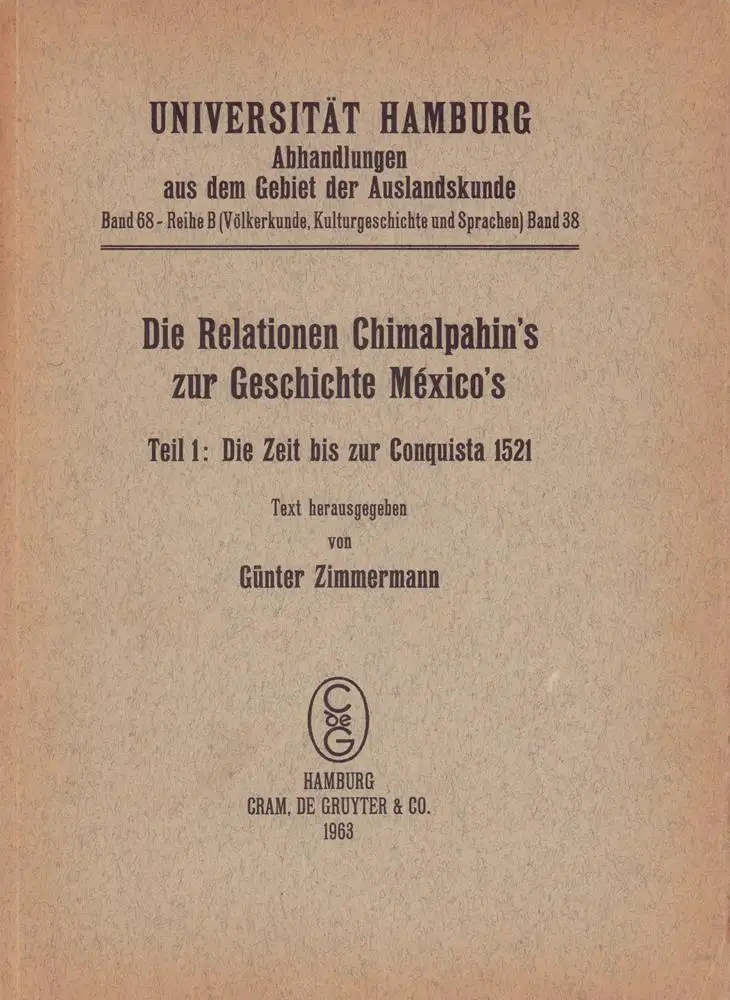 Chimalpahin u. die Kirche von San Antón Abad in México. Die aztekischen Texte: I. Memorial breve acerca de la fundacion de la ciudad de Culhuacan; II. Die Annalen 1064-1521; III: Die Achte Relation. Mit Anmerkungsteil. - Teil 2 behandelt das Jahrhundert nach der Conquista. Teil 3, der eine spanische bzw. deutsche Übersetzung der aztekischen Texte enthalten sollte, ist nicht erschienen. - Domingo Francisco de Sãn Anton Muñón Chimalpahin Quauhtlehuanitzin (1579-1660) schrieb in aztekischer Sprache wichtige Beiträge zur Geschichte Mexikos. - Günther Zimmermann (1914-1972) war Professor an der Hamburger Universität u. lehrte Ibero-Amerikanistik, Alt-Amerikanistik u. Anthropologie. - Außen randgebräunt; Seite VII/VIII mit ca. 5 cm Einriß im Kopfsteg; sonst unaufgeschnitten u. frisch