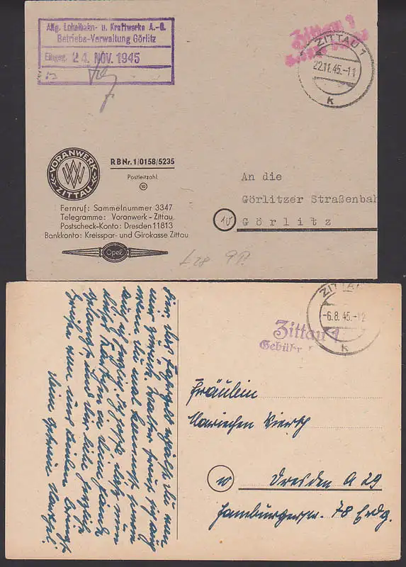 Zittau 6.8. bzw. 22.11.45 mit Z2 Gebühr Bezahlt in violett bzw. rot