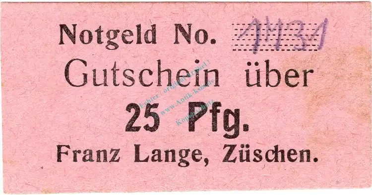Züschen , Notgeld 25 Pfennig Schein unc-kfr. Ti.8285.15.16 , Westfalen o.D. VerkehrsausgabeKleingeldersatz : Franz Lange , Züschen , RS mit Namenszug