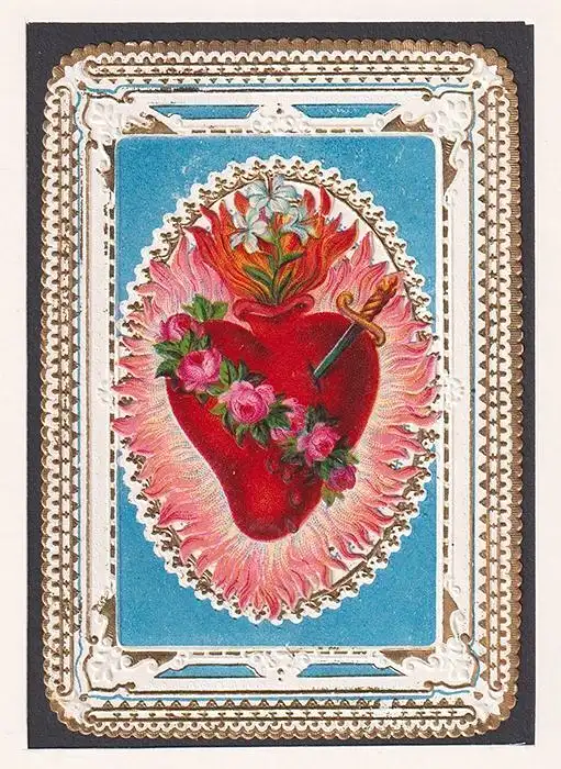 Bemerkungen: Mittig in einem Medaillon ist der (hier nicht betitelte) Nationalheilige Ungarns, der Heilige Stephan I., König von Ungarn (973-1038) als Hüftfigur mit Stephanskrone, Zepter und ungarischem Reichsapfel dargestellt. Darüber wurde eine aufklappbare Applikation in Form eines flammenden Herzens montiert. Der Gedenktag des Heiligen Stephan von Ungarn ist der 16. August.