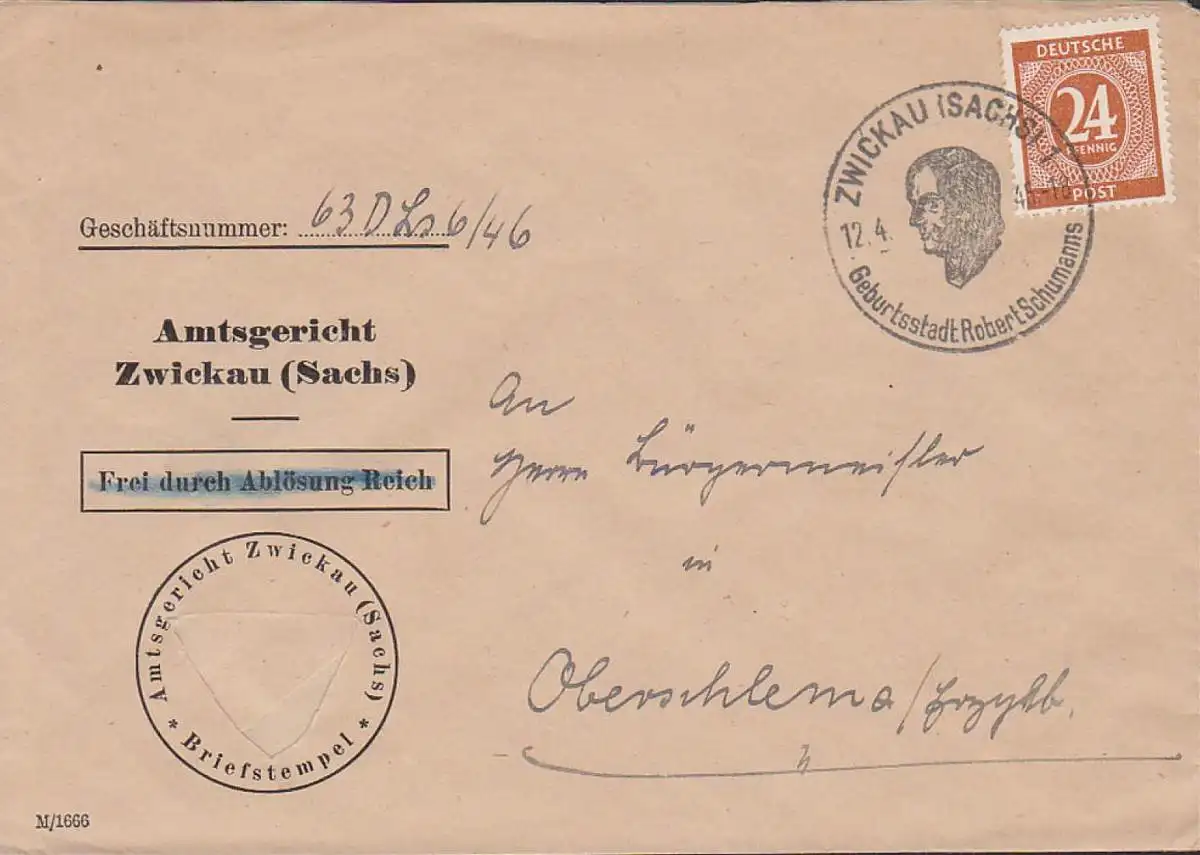 Zwickau Sachsen SoSt. Geburtsstadt Robert Schumanns, Umschlag mit entferntem Hoheitszeichen, "Frei durch.. " durchgestr.