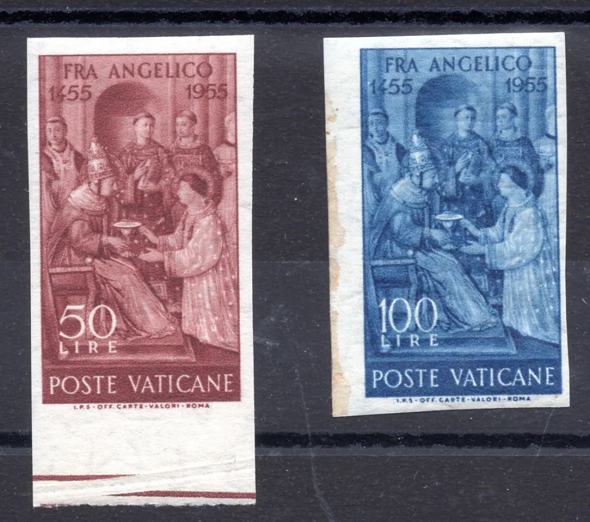 MNH Vollgummi - Fra Angelico Nr. 195/196 die Serie von zwei ungezahnten Farbversuchen, die auf filigranem Sternenpapier gedruckt sind - Der Lire 50 Farbe rot braun, der Lire 100 Farbe hellblau - Selten Cod. 755/6