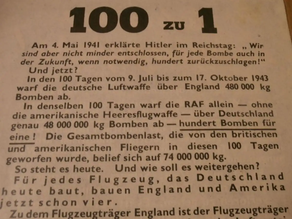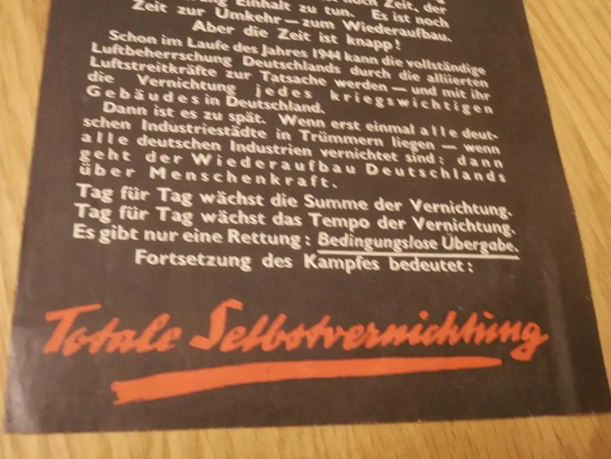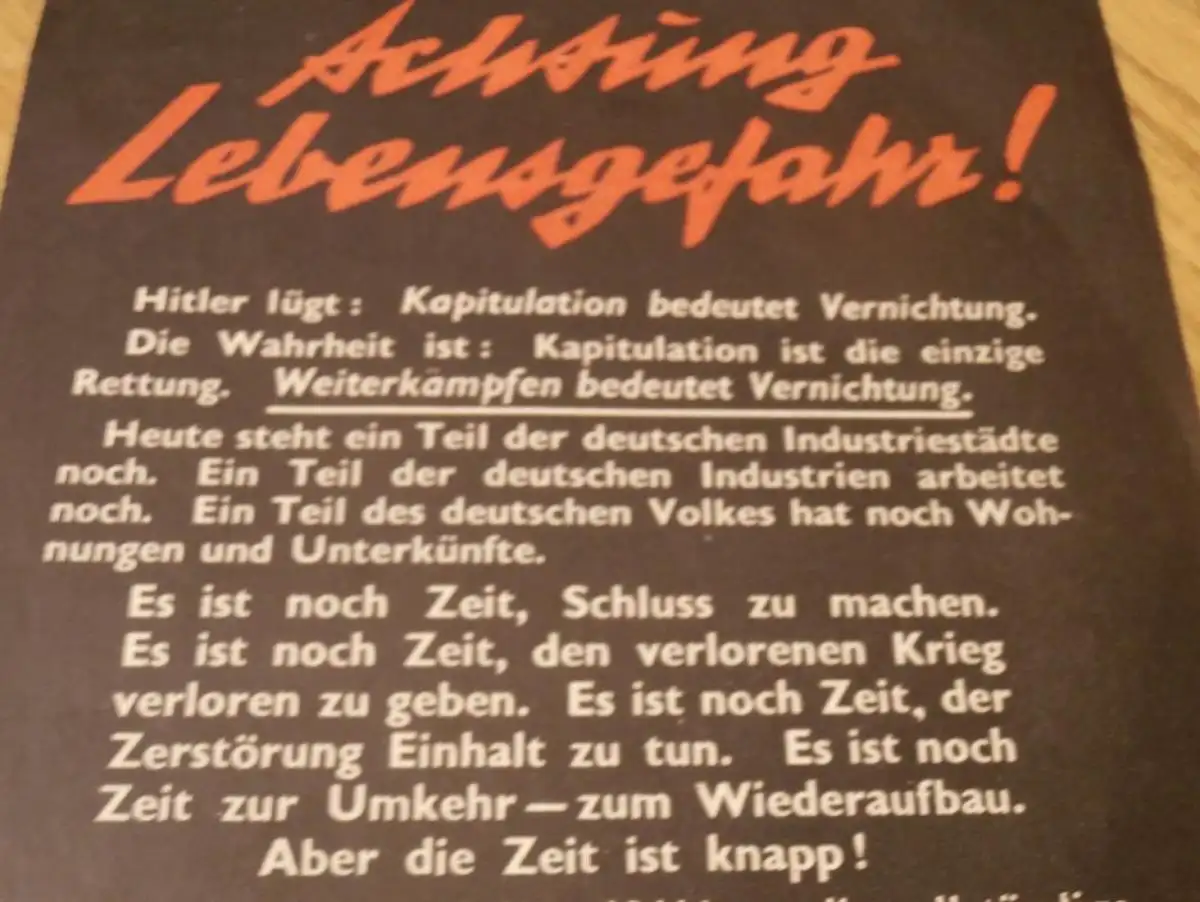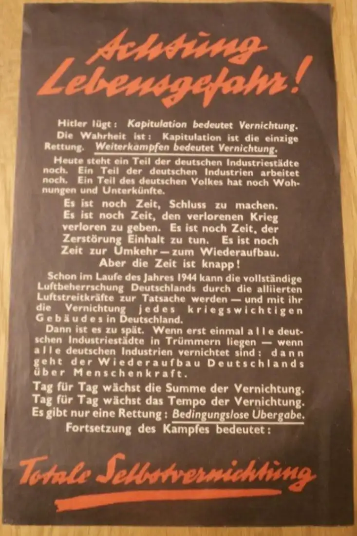 altes Original - Flugblatt 1944 , Achtung Lebensgefahr , Selbstvernichtung , Flugzeuge , Kapitulation , Propaganda !!