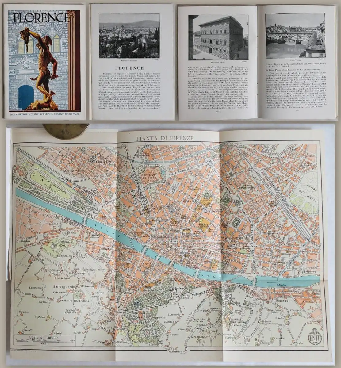 Alter Reiseprospekt/ Stadtbroschüre mit Abbildungen und einem mehrfach gefalteten Stadtplan zu Florenz in der Toskana.