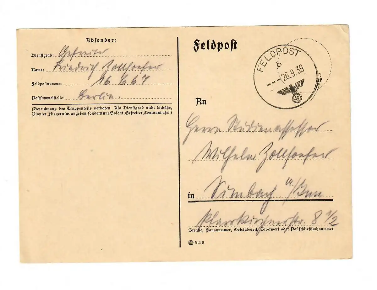 frühe Feldpost, 25.9.39, FPNr. 16667 nach Simbach am Inn